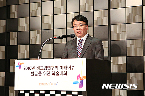【서울=뉴시스】21일 서울 양재동 엘타워에서 열린 비교법연구의 미래이슈 발굴을 위한 학술대회에 참석한 이익현 한국법제연구원 원장이 개회사를 하고 있다. 2016.10.21. (사진=한국법제연구원 제공)