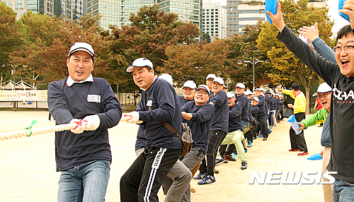 【서울=뉴시스】22일 서울시 동작구 신대방동 보라매공원에서 열린 '2016 동작가족 한마음축제에서 이창우(왼쪽앞줄)동작구청장이 상도1동 줄다리기 선수로 참여해 주민들과 힘껏 줄을 당기고 있다. 2016.10.22. (사진=동작구 제공)