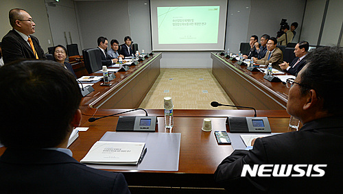 【세종=뉴시스】강종민 기자 = 수산 자원 남획 문제와 어업인 간 분쟁 해소를 최소화하기 위해 60여년만에 수산업법 개정이 추진되고 있는 가운데 26일 오후 정부세종청사에서 수협중앙회, 한국해양수산개발원, 한국법제연구원, 수산정책연구소, 대학교수 등으로 이뤄진 T/F 첫 회의가 진행되고 있다. 2016.10.26