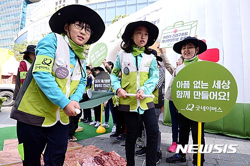 【서울=뉴시스】전신 기자 = 27일 서울 마포구 상암문화광장에서 열린 '굿네이버스 글로벌 체험전'에서 서울방화초등학교 학생들이 재난으로 인해 부상을 입은 환자를 구출하는 체험을 하고 있다. 2016.10.27