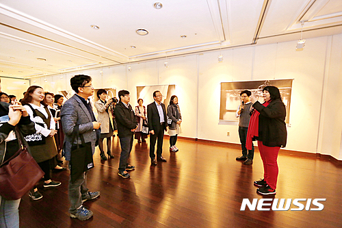 【서울=뉴시스】27일 서울 금천구 금나래아트홀갤러리에서 ‘예술, 다른 예술을 만나다’라는 주제로 열린 사회적경제 패션봉제 사진전에서 프랑스 사진작가인 울라 레이머가 설명을 하고 있다. 2016.10.27. (사진=금천구 제공)