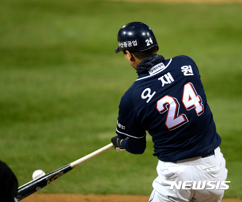 【창원=뉴시스】고범준 기자 = 2일 오후 경남 창원 마산야구장에서 열린 2016 타이어뱅크 KBO 한국시리즈 NC 다이노스와 두산 베어스의 4차전 경기, 9회초 무사 1,3루 두산 오재원이 우중간 홈런을 치고 있다. 2016.11.02.