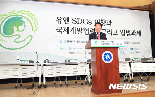 【서울=뉴시스】8일 서울 여의도 국회 의원회관 제1소회의실에서 한국법제연구원 주최로 '유엔 SDGs 이행과 국제개발협력, 그리고 입법과제'를 주제로한 세미나가 열린 가운데 새누리당 권성동 의원이 환영사를 하고 있다. 2016.11.08. (사진=한국법제연구원 제공)