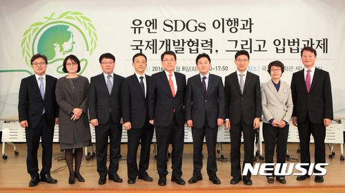 【서울=뉴시스】8일 서울 여의도 국회 의원회관 제1소회의실에서 한국법제연구원 주최로 '유엔 SDGs 이행과 국제개발협력, 그리고 입법과제'를 주제로한 세미나가 열린 가운데 참석자들이 기념촬영을 하고 있다. 2016.11.08. (사진=한국법제연구원 제공)