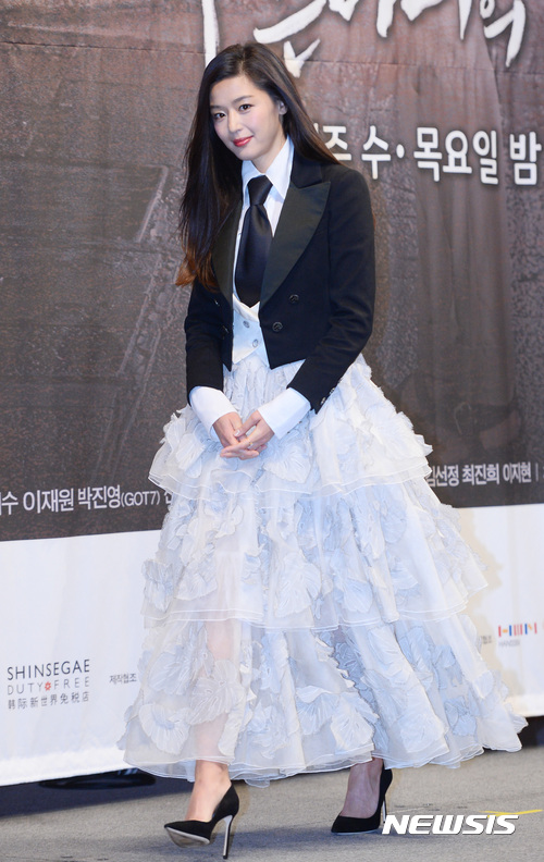 【서울=뉴시스】김진아 기자 = 배우 전지현이 14일 서울 강남구 임피리얼팰리스호텔에서 열린 SBS 드라마 '푸른 바다의 전설' 제작발표회에서 포즈를 취하고 있다.