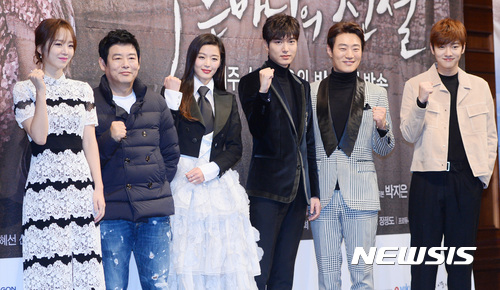 【서울=뉴시스】김진아 기자 = 출연배우들이 14일 서울 강남구 임피리얼팰리스호텔에서 열린 SBS 드라마 '푸른 바다의 전설' 제작발표회에서 포즈를 취하고 있다. 왼쪽부터 배우 신혜선, 성동일, 전지현, 이민호, 이희준, 신원호.