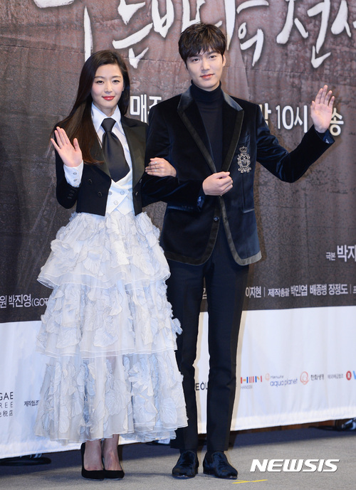 【서울=뉴시스】김진아 기자 = 배우 전지현, 이민호가 14일 서울 강남구 임피리얼팰리스호텔에서 열린 SBS 드라마 '푸른 바다의 전설' 제작발표회에서 포즈를 취하고 있다.
