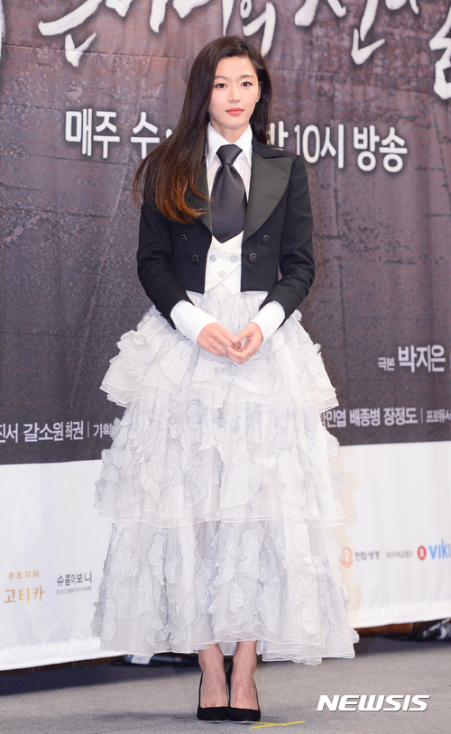 【서울=뉴시스】김진아 기자 = 배우 전지현이 14일 서울 강남구 임피리얼팰리스호텔에서 열린 SBS 드라마 '푸른 바다의 전설' 제작발표회에서 포즈를 취하고 있다.