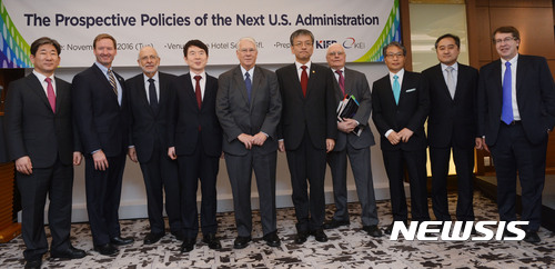 【서울=뉴시스】홍효식 기자 = 15일 오전 서울 중구 소공동 롯데호텔에서 대외경제정책연구원(KIEP)과 한미경제연구소(KEI)가 공동 주최해 열린 미국 신정부 정책전망 세미나에서 참석자들이 기념촬영을 하고 있다. 2016.11.15.
