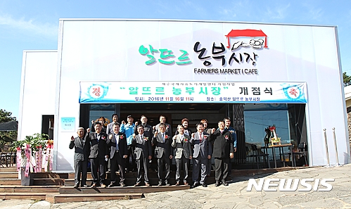 【제주=뉴시스】우장호 기자 = 제주국제자유도시개발센터(JDC)는 16일 오전 제주 서귀포시 대정읍 상모1리에서 감자, 고구마, 마늘, 브로콜리 등 마을에서 직접 생산한 농산물을 판매하는 직판장인 '알뜨르 농부시장' 개점행사를 개최했다. 2016.11.16.
