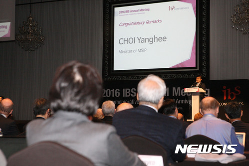 【서울=뉴시스】최양희 미래창조과학부 장관이 17일 대전광역시 유성구 ICC호텔에서 열린 기초과학연구원(IBS) 개원 5주년 기념식에 참석해 축사하고 있다. 2016.11.17. (사진=미래창조과학부 제공)