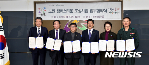 【서울=뉴시스】17일 오후 서울 노원구청 소회의실에서 열린 캠퍼스 타운 조성사업 업무 협약식에서 김성환 구청장과 협약 체결 기관장들이 기념 촬영을 하고 있다. 2016.11.17. (사진=노원구 제공)