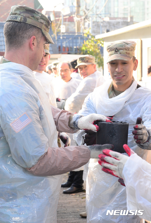 【서울=뉴시스】권현구 기자 = 주한미군 장병들과 서울관광마케팅 임직원들이 23일 오전 서울 은평구 수색동 일대에서 연탄나눔 행사를 펼치고 있다. 2016.11.23.