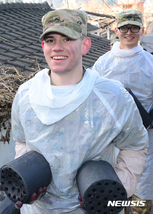 【서울=뉴시스】권현구 기자 = 주한미군 장병들이 23일 오전 서울 은평구 수색동 일대에서 연탄나눔 행사를 펼치고 있다. 2016.11.23.