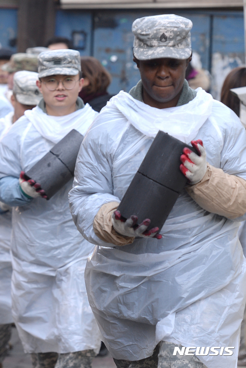 【서울=뉴시스】권현구 기자 = 주한미군 장병들과 서울관광마케팅 임직원들이 23일 오전 서울 은평구 수색동 일대에서 연탄나눔 행사를 펼치고 있다. 2016.11.23.