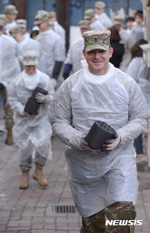 【서울=뉴시스】권현구 기자 = 주한미군 장병들과 서울관광마케팅 임직원들이 23일 오전 서울 은평구 수색동 일대에서 연탄나눔 행사를 펼치고 있다. 2016.11.23.