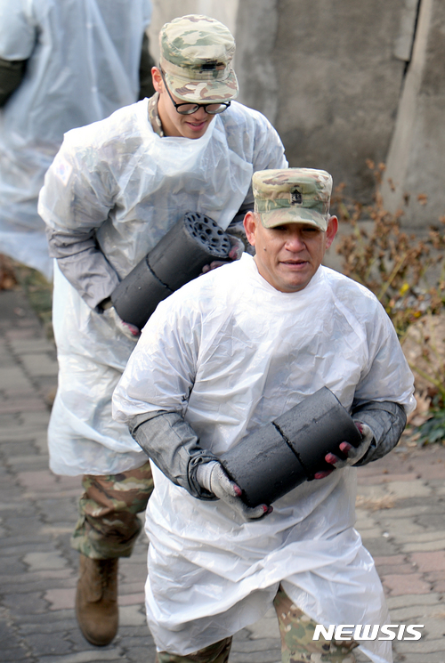 【서울=뉴시스】권현구 기자 = 주한미군 장병들과 서울관광마케팅 임직원들이 23일 오전 서울 은평구 수색동 일대에서 연탄나눔 행사를 펼치고 있다. 2016.11.23.