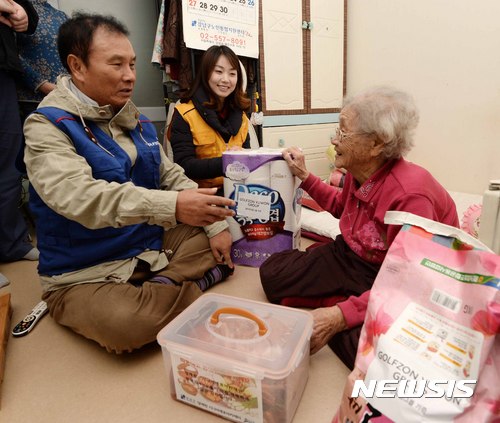 【서울=뉴시스】고범준 기자 = 25일 오후 서울 강남구 수서명화종합사회복지관에서 열린 '2016 나눔과 배려 봉사활동'에서 김영찬 골프존유원그룹 회장(왼쪽)과 골프선수 김혜윤 프로 가 소외계층 가정을 방문해 어르신께 김치와 휴지 등 생필품을 전달하고 대화를 하고 있다.