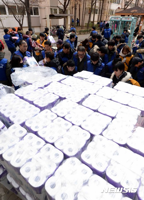 【서울=뉴시스】고범준 기자 = 25일 오후 서울 강남구 수서명화종합사회복지관에서 열린 '2016 나눔과 배려 봉사활동'에서 골프존유원그룹 임직원들이 휴지 등 생필품을 배달하고 있다.