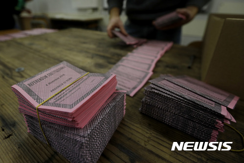 【로마=AP/뉴시스】3일(현시시간) 이탈리아 로마의 한 투표소에서 4일 치러지는 개헌안 국민투표를 앞두고 투표용지 분류 작업이 이뤄지고 있다. 마테오 렌치 총리가 국민투표 부결시 사퇴 가능성을 내비쳤기 때문에 이번 국민투표는 렌치 총리 신임투표 성격이 강하다. 2016.12.04