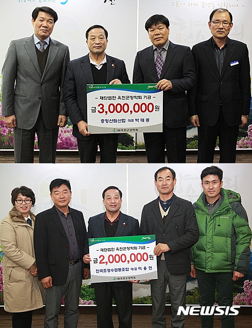 【옥천=뉴시스】이성기 기자 = 14일 오전 충청산림산업 박태종 대표(위 왼쪽 세번째)와 전국조경수협동조합 이용현 대표(아래 왼쪽 네번째)가 옥천군청을 방문해 김영만 옥천군장학회 이사장에게 지역 인재 양성에 써달라며 장학금을 기탁하고 있다.2016.12.14(사진=옥천군 제공)