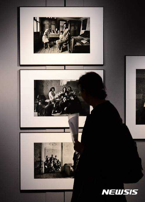 【서울=뉴시스】추상철 기자 = 체코 출신 프랑스 사진작가 요세프 쿠델카 사진전 '집시' 개막을 하루 앞둔 16일 오전 서울 송파구 한미사진미술관에서 사진작가와 취재진 등이 작품을 살펴보고 있다.