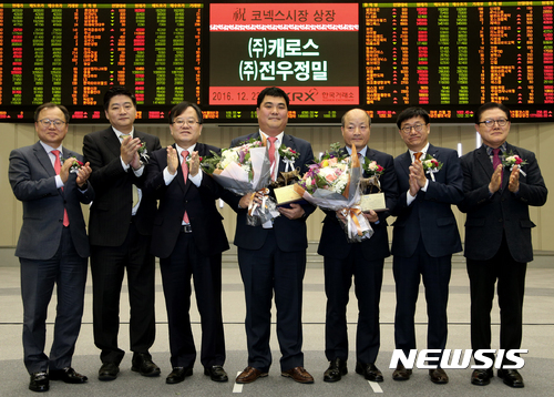 【서울=뉴시스】한국거래소 코스닥시장본부는 23일 오전 서울 여의도 서울사옥 홍보관에서 우유눈꽃빙수기 전문제조업체인 캐로스와 도어 및 자동변속기 관련 자동차부품 제조업체인 전우정밀의 코넥스시장 신규상장기념식을 개최했다.
