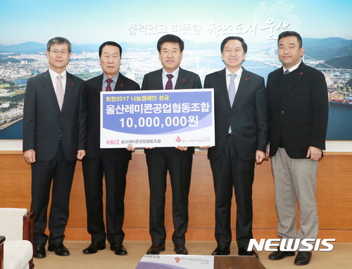 【울산=뉴시스】배병수 기자 = 울산레미콘공업협동조합 김성대 이사장이 지난 27일 울산시청 시장접견실에서 동절기를 맞아 소외계층을 대상으로 성금을 전달하고 있다. 2016.12.28. (사진 = 울산시청 제공).