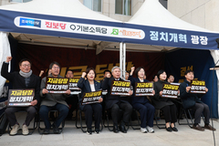 조국혁신당·진보당·기본소득당·사회민주당 등 진보 야4당은 13일 정치개혁 농성 5일차 결의대회를 열었다. 앞서 이들 4당은 지난 9일 3~5인 중대선거구제 도입, 비례대표 정수 확대 등을 촉구하며 천막 농성에 돌입한 바 있다. 이들은 이날 국회 본청 앞 농성장에서 "국민의 준엄한 명령인 정치 개혁은 계엄군이 침범해 짓밟았던 폐허가