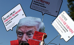 도널드 트럼프 미국 대통령이 APEC(아시아태평양경제협력체) 참석차 방한한 29일 경북 경주에서 반(反) 트럼프 규탄 집회가 벌어졌다. 2025 APEC반대 트럼프반대 국제민중행동 조직위원회(국제민중행동)는 이날 오전 경주시 동천동 구황교 인근에서 기자회견을 열고 "모든 국제적 행사를 무시하고 자기 입맛대로 쓰고 버리는 트럼프를 강력히 규