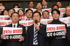 더불어민주당은 4일 대장동 개발 비리·쌍방울 대북송금·김용 전 민주연구원 부원장·서해공무원 피살 사건 등 윤석열 정권 정치 검찰이 조작 기소를 벌였다며 책임자 처벌을 촉구하는 규탄대회를 열었다. 민주당은 앞서 제출한 국정조사 외에도 청문회, 특별검사 등 모든 수단을 총동원하겠다고 했다. 정청래 민주당 대표는 이날 오전 국회 로텐더홀에서 열