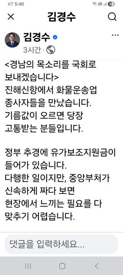 김경수 더불어민주당 경남도지사 후보가 4일 자신의 페이스북에 '유가보조금 현실화'를 위한 의지와 각오를 밝혀 눈길을 끌었다. 김 후보는 '경남의 목소리를 국회로 보내겠습니다' 제목의 게시글에서 "(어제) 진해신항에서 화물운송업 종사자들을 만났다. 기름값이 오르면 당장 고통 받는 분들"이라며 "정부 추경에 유가보조지원금이