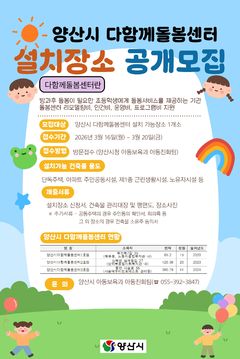 경남 양산시는 20일까지 초등학생을 위한 돌봄 사각지대 해소와 안정적인 돌봄환경 제공을 위해 다함께돌봄센터 설치장소를 공개모집한다고 4일 밝혔다. 다함께돌봄센터는 소득수준과 관계없이 6~12세 초등학생에게 상시·일시 돌봄, 체험활동, 학습·놀이 프로그램 등을 제공하는 시설로 지역 내 틈새 돌봄 기능을 강화하고 돌봄 사각지대를 해소하기 위해 운영된다