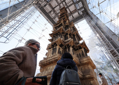 4일 오후 서울 종로구 탑골공원에서 시민들이 국보 2호 원각사지 십층석탑을 살펴보고 있다. 종로구는 이날부터 15일까지 탑골공원 내 국보 2호 원각사지 십층석탑 내부를 시민에 공개한다. 1999년 산성비와 조류 배설물로부터 석탑을 보호하기 위해 유리 보호각을 설치한 이후 시민이 석탑 바로 앞까지 다가설 수 있게 된 것은 사실상 이번이 처음이다.