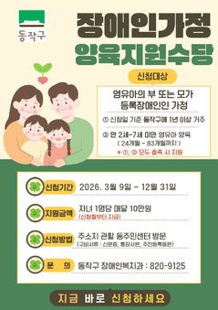 서울 동작구는 관내 장애인 가정의 경제적 부담을 덜고 안정적인 양육 환경을 지원하기 위해 올해부터 '장애인가정 양육지원수당'을 신설해 지급한다고 22일 밝혔다. 지원 대상은 구에 1년 이상 주민등록을 두고 거주하면서 장애인 본인 또는 배우자가 출산한 만 2세 이상 7세 미만 아동을 양육하는 가정이다. 신청한 달부터 아동이 만 7세가 되는 달의 전월