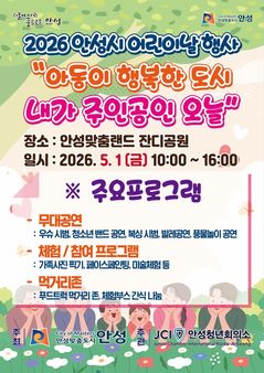경기 안성시는 오는 5월1일 안성맞춤랜드에서 '제104회 어린이날' 기념행사를 진행한다. 이번 행사는 2026년 노동절이 공휴일로 지정됨에 따라 부모들이 일터에서 벗어나 자녀와 함께 충분한 시간을 보내며 가족 간의 유대감을 쌓을 수 있도록 앞당겨 진행된다. '아동이 행복한 도시, 내가 주인공인 오늘!'을 주제로 진행되는 이번 행사는 ▲우슈 및