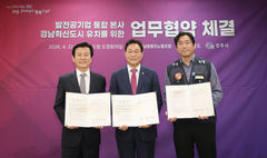경남도와 진주시, 한국남동발전노동조합이 22일 발전 공기업 통합 본사의 경남혁신도시 유치를 위해 손을 맞잡았다. 박완수 도지사와 조규일 진주시장, 김재민 한국남동발전노조 위원장은 이날 오후 도청 도정회의실에서 '발전 공기업 통합 본사 경남혁신도시 유치를 위한 업무협약'을 체결했다. 이번 협약은 발전사 통합이라는 국가 정책 기조에 맞춰 지자체와 노