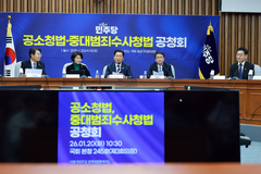 더불어민주당이 20일 중대범죄수사청(중수청)·공소청 신설을 골자로 한 정부 검찰개혁안을 두고 공청회를 가졌다. 정청래 대표는 "민주주의 발전이라는 큰 물줄기 위에서 논의되고 시행될 것"이라며 수사·기소 분리 원칙을 재확인했다. 정 대표는 이날 국회 본청에서 열린 '공소청·중대범죄수사청법 공청회'에서 "오늘 우리는 검찰