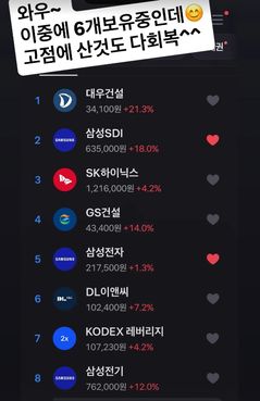 가수 미나가 주식 투자로 수익을 냈다고 밝혔다. 미나는 21일 소셜미디어에 "와우 이중에 6개 보유 중인데"라는 글과 함께 사진을 공개했다. 사진에는 SK하이닉스, 삼성전자 등 주요 종목들의 수익률이 담겼다. 그는 "고점에 산 것도 다 회복"이라며 기쁜 마음을 드러냈다. 미나는 과거