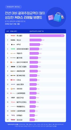 시장·경쟁사 분석 솔루션 와이즈앱·리테일이 한국인의 신용카드 및 체크카드 결제 데이터를 표본 조사한 결과 올해 1분기(1~3월) 합산 결제추정금액이 전년 동기 대비 가장 크게 증가한 브랜드는 유니클로로 나타났다고 22일 밝혔다. 유니클로의 결제추정금액 성장률은 81.4%에 달했다. 이어 무신사(28.7%), 애플(25.1%), 네이버·네이버페