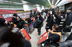 전국장애인차별철폐연대(전장연)가 4일 서울 지하철 5호선 광화문역 승강장에서 '제67차 출근길 지하철 탑니다' 시위를 벌였다. 전장연의 시위는 광화문역에서 9호선 국회의사당역까지 이어질 예정이다. 이외에도 서울 지하철 1호선 남영역에서도 예고 없이 탑승 시위를 해 열차가 지연되는 등 출근길 시민들이 불편을 겪었다. 앞서 전장연은 지난 3일에도