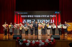 충북 증평군자원봉사종합센터는 4일 증평문화회관에서 '2025년 증평군 자원봉사자의 날 기념식'을 열었다. 자원봉사자 200여명이 참석한 이날 행사는 ▲축하공연 ▲2025년 자원봉사 활동 영상 시청 ▲자원봉사 릴레이기 반납 ▲유공자 시상 등의 순으로 이뤄졌다. 자원봉사자의 날(12월5일)은 자원봉사활동에 대한 참여를 촉