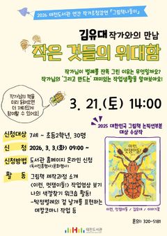 대구 행복북구문화재단 태전도서관은 김유대 작가와 함께하는 그림책 강연을 연다고 9일 밝혔다. 강연은 21일 오후 2시 '작은 것들의 위대함'을 주제로 진행된다. 김 작가는 지난해 대한민국 그림책상 논픽션 부문 대상을 수상한 작가다. 강연에서는 그림책 '이런 멋쟁이들'을 중심으로 작은 존재들이 지닌 의미와 가치를 소개한다. 특히 50여