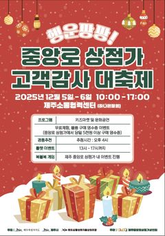 제주시는 5~6일 중앙로 상점가 일대에서 연말 세일 페스타 '행운팡팡! 고객감사 대축제'를 연다고 4일 밝혔다. 이번 행사는 중소벤처기업부 공모사업 일환이다. 제주원도심활성화자율상권조합과 함께 원도심 상권인 중앙로 상점가에 활기를 불어넣기 위해 마련됐다. 행사 기간 ▲구매 영수증 경품 추천 이벤트 ▲버스킹 공연 ▲키즈마켓데이 이벤트 ▲미니게임 등