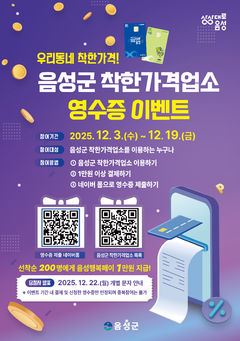 충북 음성군은 지역 착한가격업소 활성화를 위한 영수증 이벤트를 진행한다고 3일 밝혔다. 이날부터 오는 19일까지 관내 28개 착한가격업소에서 1만원 이상 결제하고 QR코드로 네이버폼에 접속, 영수증 인증 등 참여 정보를 제출하면 된다. 군은 선착순 200명에게 음성행복페이 1만원을 지급한다. 당첨자는 오는 22일 개별 통보된다. ◇음성군