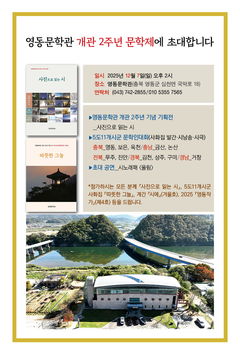 충북 영동문학관은 문학관 개관 2주년 기념 문학제를 7일 오후 2시 문학관(심천면 국악로)에서 개최한다고 2일 밝혔다. '사진으로 읽는 시'로 명명한 기획전과 '5도 11개 시군 문학인 대회'가 문학제를 구성하는 핵심 프로그램이다. 기획전에선 사진작가로도 왕성하게 활동하는 김이하·김인호·김해화·성태현·이강산·이원규 시인의 자선 시와 문학관 상
