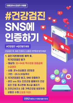 충북 진천군보건소는 의료급여수급권자의 국가건강검진 참여 유도를 위한 이벤트를 진행한다고 18일 밝혔다. 대상은 20세 이상 64세 이하의 짝수년생 의료급여수급권자로, 9월30일까지 국가건강검진을 받은 뒤 사회관계망서비스(SNS)에 인증하면 된다. 참여자에게는 온누리상품권 2만원권이 지급된다. 참여자는 검진기관을 예약해 검진을 받은 뒤 본인 S