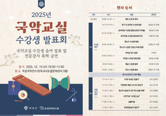 전남 곡성군은 오는 10일 오전 10시 옥과면의 곡성국악전수관에서 '2025년 국악교실 수강생 발표회'를 개최한다고 3일 밝혔다. 행사는 장구·농악반의 발표를 시작으로 판소리, 한국무용, 민요, 가야금, 해금 등이 연주된다. 또 2부에서는 12현 가야금 '침향무', 지영희류 해금 산조 중 '중모리', 판소리 춘향가 중 '어사 상봉 대목', 국악가