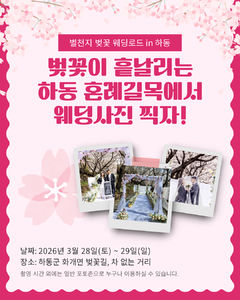 경남 하동군은 27일부터 29일까지 열리는 '제27회 화개장터 벚꽃축제'를 앞두고 특별한 웨딩 촬영 이벤트의 참가 신청을 받는다고 6일 밝혔다. 축제 기간 중 진행될 이번 이벤트는 28~29일 화개십리벚꽃길 차 없는 거리 구간에서 진행된다. 화개십리벚꽃길은 벚꽃나무 아래에서 혼담을 나누면 백년해로를 기약한다는 전설이 전해져 예로부터 '혼례길목