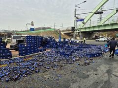 좌회전 하던 트럭서 맥주병 수백개 '와르르'…도로정체